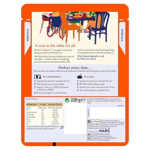 Ben's Original™ Basmati microwave rice is a simple and versatile option for a quick, delicious meal. Perfectly steamed and ready in just 2 minutes, this microwaveable rice offers convenience without compromising on taste. Ideal for busy weeknights, it pairs well with a variety of dishes such as chickpea curry, creamy coconut chicken, or your own culinary creations. With no artificial colours, flavours, or preservatives, it's a wholesome choice for vegetarians. The rice is sustainably sourced and comes in a convenient pouch for easy prep and cleanup.