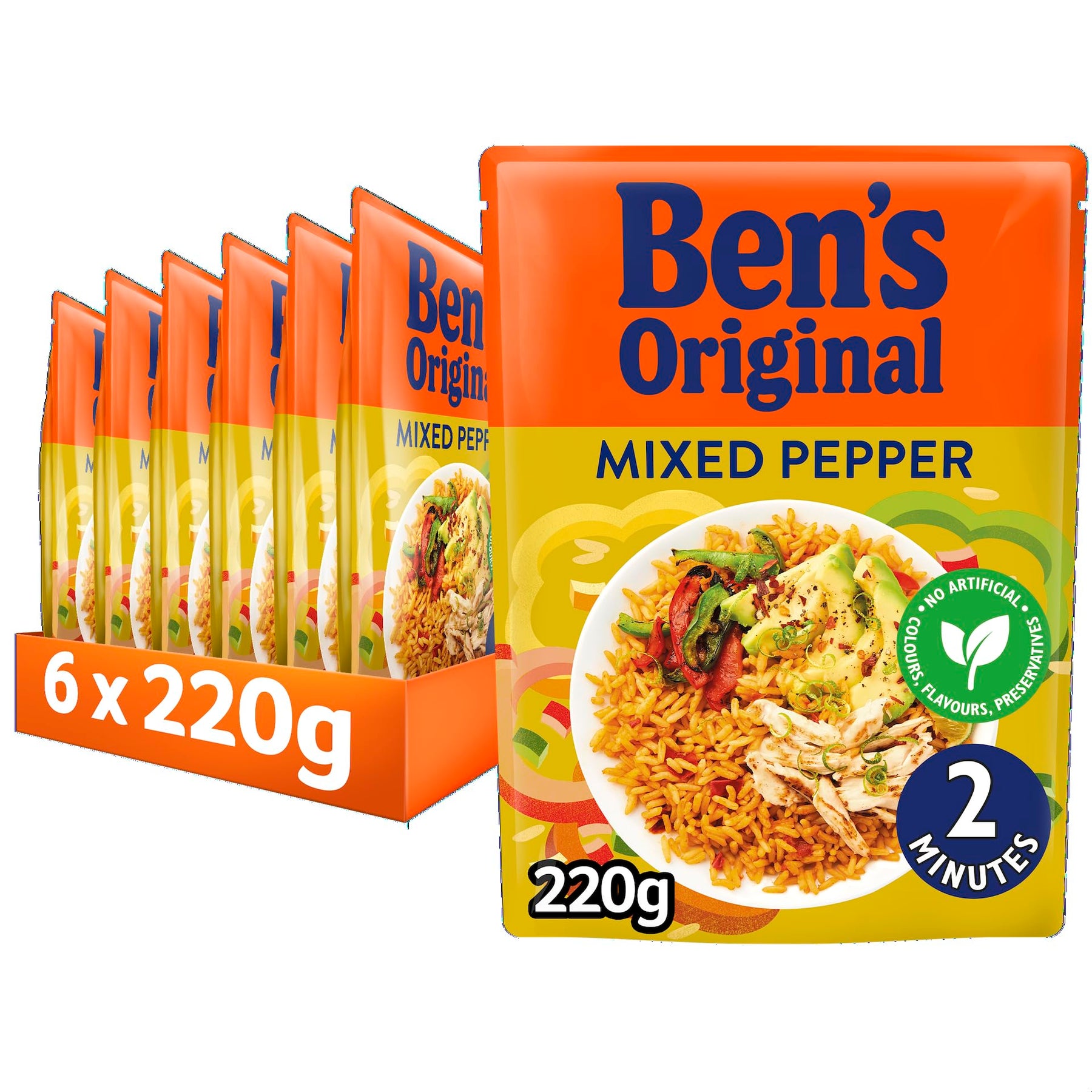 Ben's Original Mixed Pepper Microwave Rice combines perfectly steamed long grain rice with vibrant red, green, and yellow peppers for a flavorful and convenient meal. Ready in just 2 minutes in the microwave, this ready-to-eat rice is ideal for quick lunches, dinner sides, or creative rice bowls. With no artificial colours, flavours, or preservatives, it's a tasty and wholesome option suitable for vegetarians.