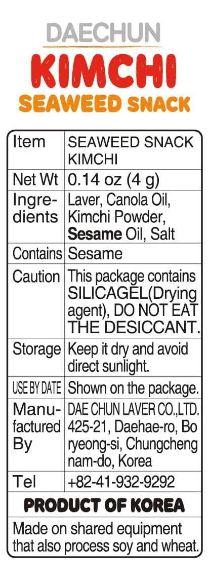 Enjoy the savory crunch of Daechun Kimchi Seaweed Snacks, expertly roasted and individually packed for maximum freshness. Harvested from the clean waters of Korea's West Sea, these seaweed sheets are a nutritious, low-calorie snack option at just 20 calories per pack. Perfect for on-the-go snacking, each of the 20 packs maintains crispness and flavor thanks to humidity-resistant packaging.