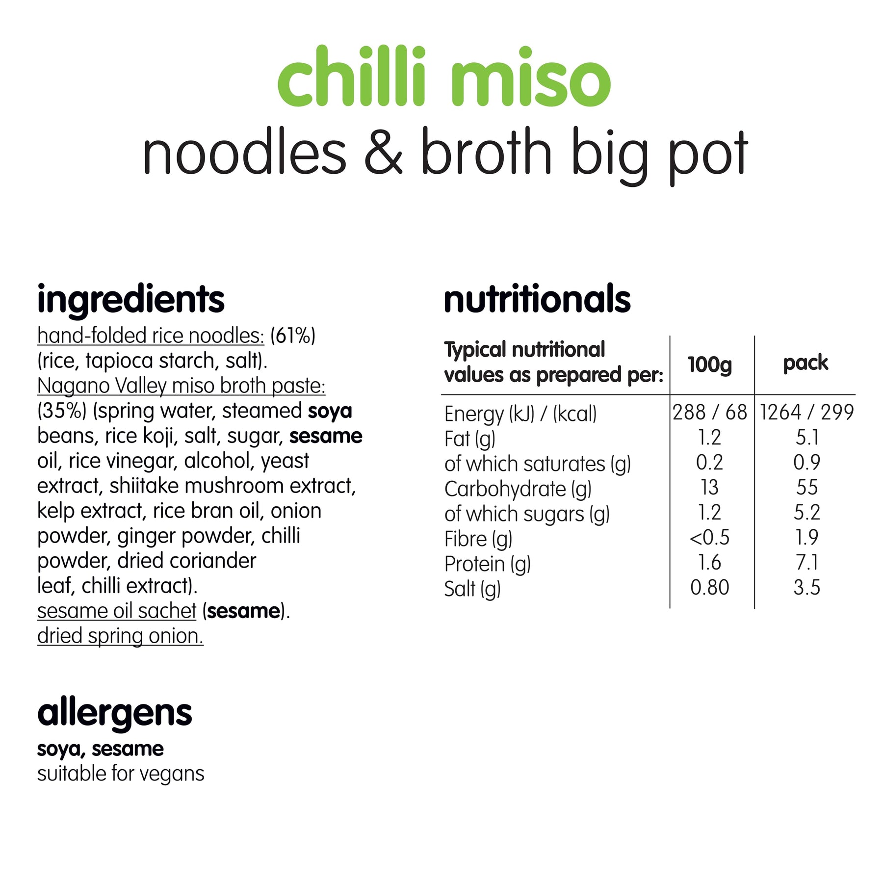 • Nagano Valley miso broth paste (35%) with spring water, steamed soya beans, rice koji, and natural flavourings