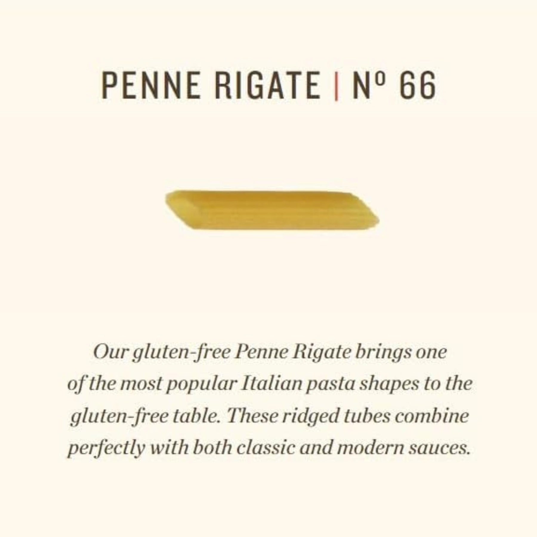 • Traditional penne rigate shape with ridges for optimal sauce adherence