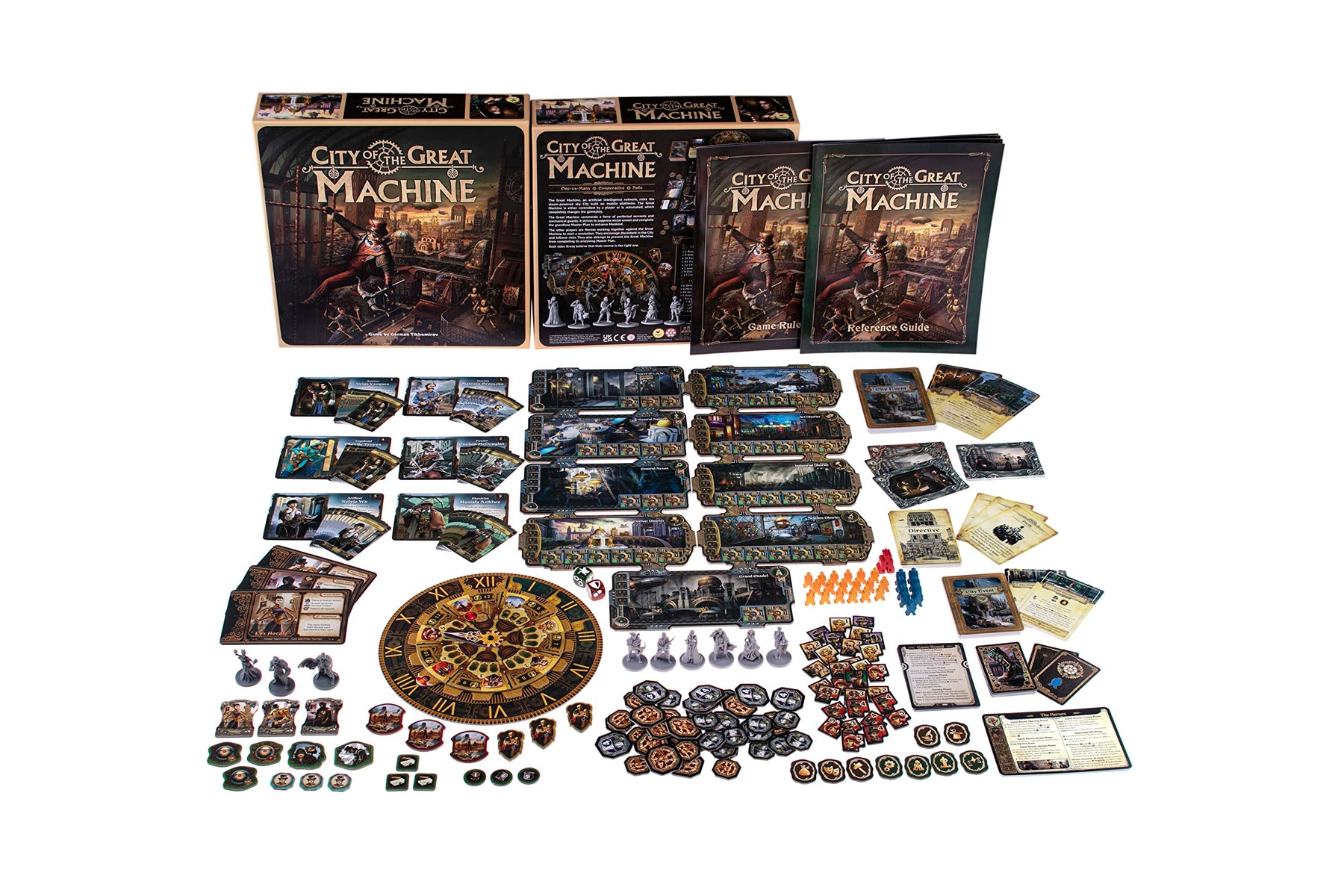City of the Great Machine is a strategic one-vs-many and cooperative board game set in a Victorian steampunk universe. Players face off in a thrilling conflict between the all-powerful Great Machine—an artificial intelligence network—and a team of heroic revolutionaries. As the Great Machine, one player commands mechanical guards and engineered servants to complete a grand Master Plan to perfect humanity. Alternatively, players can join forces as Heroes, working covertly to spark rebellion and stop the Machine’s oppressive vision.