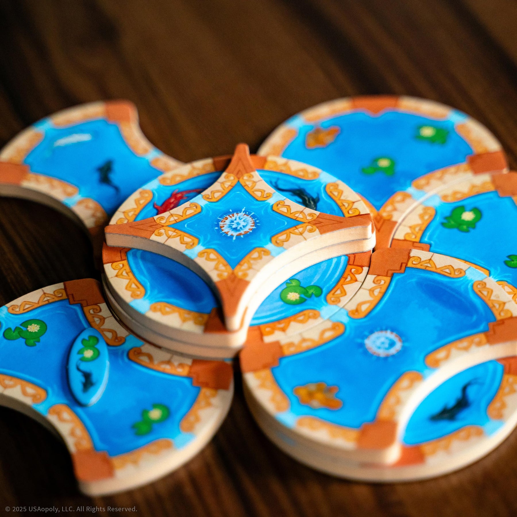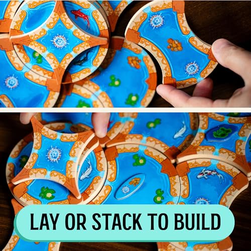 - Players take turns moving tokens clockwise around the central board to collect tiles and build upward and outward, ensuring water flows through all levels to avoid dead zones